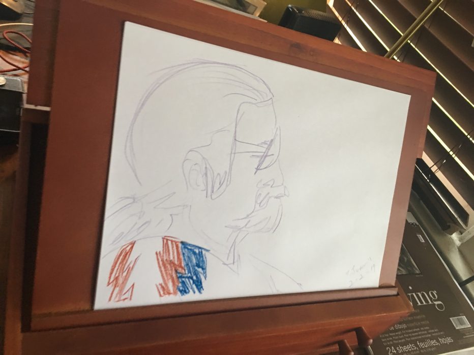 Day 3: Here is a sketch of Juan. For this, I used a board Maya had stored on a shelf which takes some getting used to. Edwards’ suggested trying it out for drawing. I usually write in a notebook on a table or on my lap. I used a purple color pencil & sketched this in about 5 minutes.